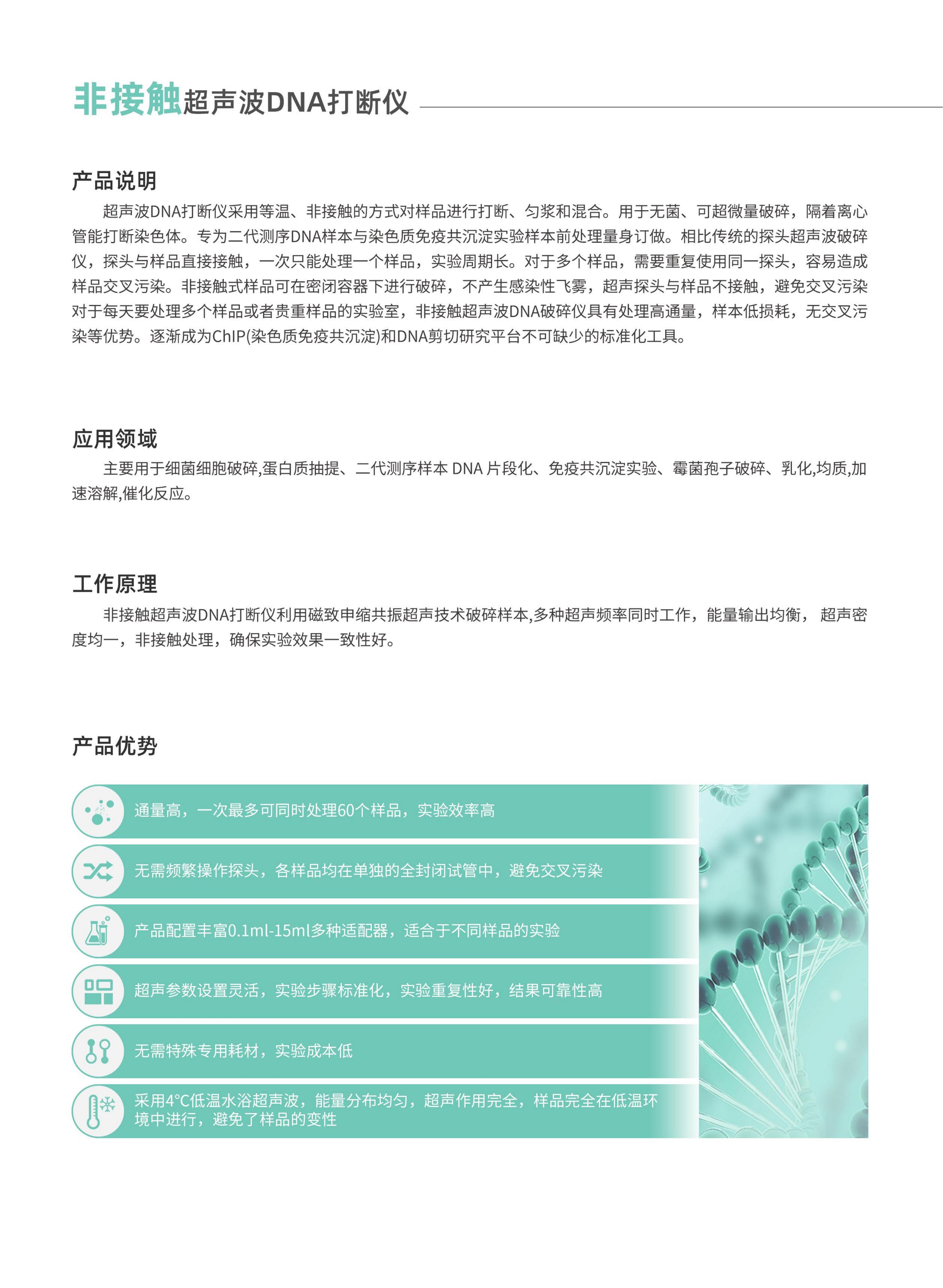 超声波DNA打断仪采用等温、非接触的方式对样品进行打断、匀浆和混合。用于无菌、超微量破碎,隔着离心管能打断染色体。专为二代测序DNA样本与染色质免疫共沉淀实验样本前处理量身订做。