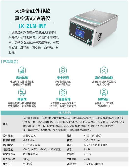 大通量红外线款真空离心浓缩仪JX-ZLN-INF是一款用于样品浓缩或干燥的科学仪器。设备提供真空状态,电加热和红外灯辅助加热,提升浓缩性能,同时离心作用防止交叉污染,保证样品安全。大通量红外款在腔体容量加大的同时,采用红外线辅助蒸发,加快样本浓缩效率。该款仪器适配多种类型转子,可放离心管、进样瓶、鸡心瓶、西林瓶、吊篮等。