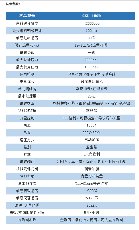 产品简介:上海净信高压纳米均质机GSL-15QD是一种超细粉碎,乳化设备。仪器操作简便灵活,动力特性独特,维护成本较低,安全性高,过压自动停机,破碎率>95%,实现物料零残留。